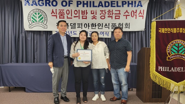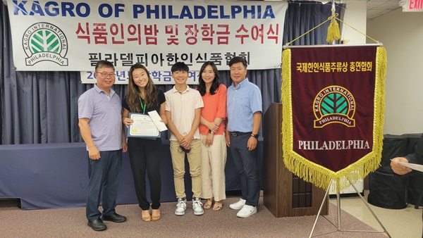 필라델피아 한인식품인협회는 서재필 봉사센터 에서 717 2022년도장학금 수여식을 갖고 센트럴 벅스 하이 스쿨의 김예준 학생과 애빙턴 하이스쿨의 자키안 자몬  한인과 미국 학생 10명에게  1 달러씩 1 달러의 장학금을 수여했다.