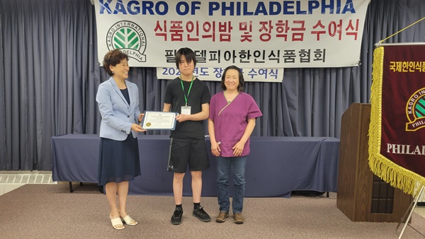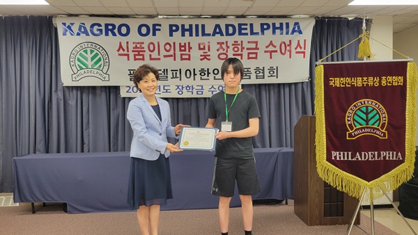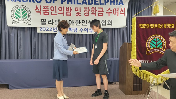 필라델피아 한인식품인협회는 서재필 봉사센터 에서 717 2022년도장학금 수여식을 갖고 센트럴 벅스 하이 스쿨의 김예준 학생과 애빙턴 하이스쿨의 자키안 자몬  한인과 미국 학생 10명에게  1 달러씩 1 달러의 장학금을 수여했다.