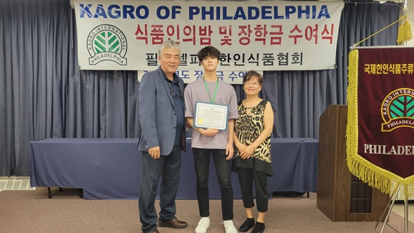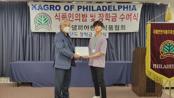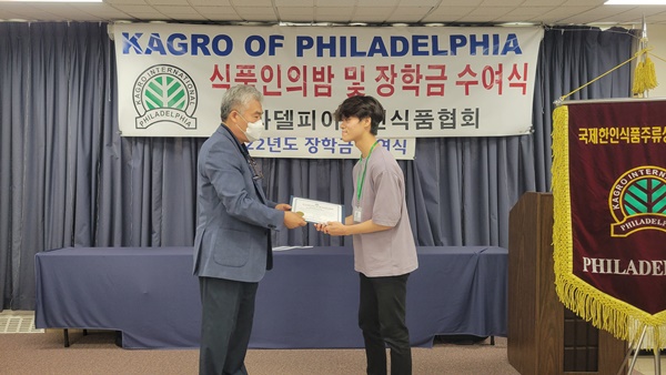필라델피아 한인식품인협회는 서재필 봉사센터 에서 717 2022년도장학금 수여식을 갖고 센트럴 벅스 하이 스쿨의 김예준 학생과 애빙턴 하이스쿨의 자키안 자몬  한인과 미국 학생 10명에게  1 달러씩 1 달러의 장학금을 수여했다.