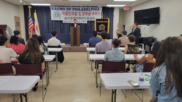 필라델피아 한인식품인협회는 서재필 봉사센터 에서 717 2022년도장학금 수여식을 갖고 센트럴 벅스 하이 스쿨의 김예준 학생과 애빙턴 하이스쿨의 자키안 자몬  한인과 미국 학생 10명에게  1 달러씩 1 달러의 장학금을 수여했다.