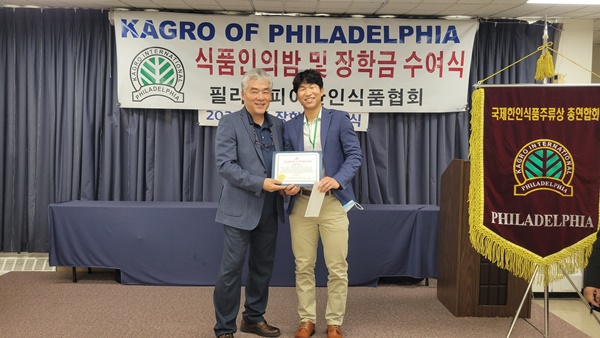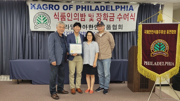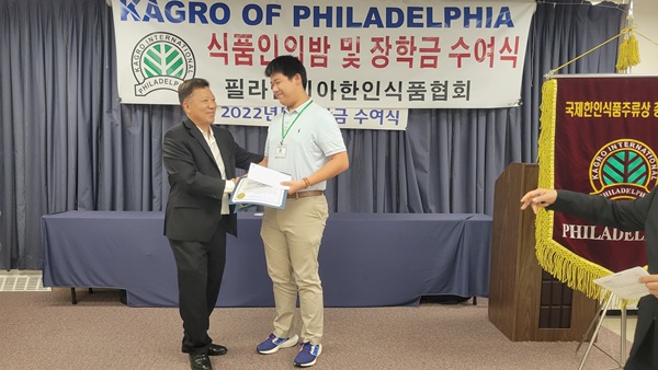 필라델피아 한인식품인협회는 서재필 봉사센터 에서 717 2022년도장학금 수여식을 갖고 센트럴 벅스 하이 스쿨의 김예준 학생과 애빙턴 하이스쿨의 자키안 자몬  한인과 미국 학생 10명에게  1 달러씩 1 달러의 장학금을 수여했다.